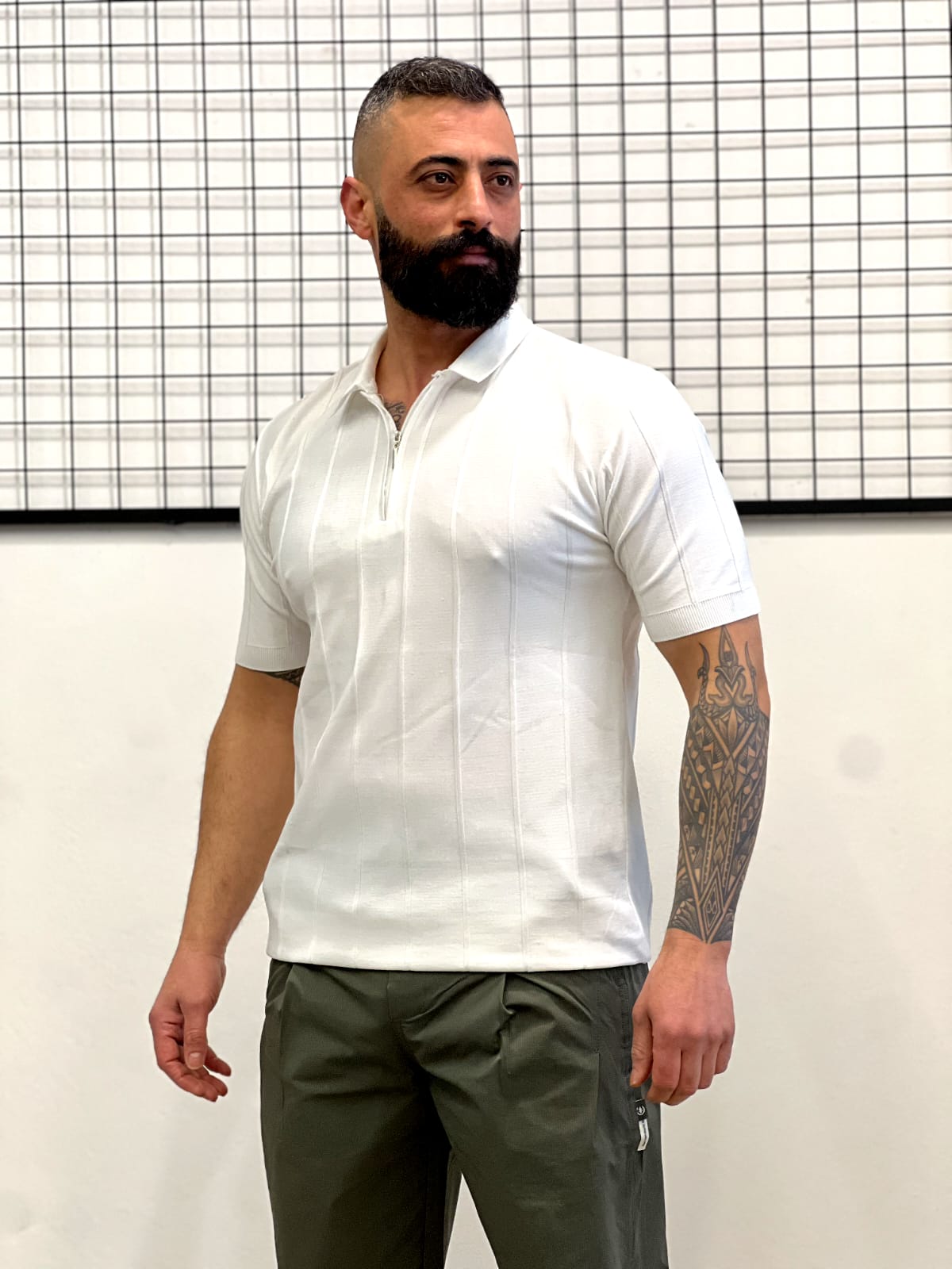 Crafted with a soft, breathable fabric, it offers a lightweight feel that keeps you comfortable throughout the day. The ribbed vertical texture adds a subtle detail that elevates the overall look, giving it a more refined and structured appearance compared to regular polos.
